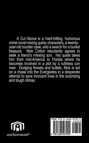 A CUT ABOVE is a hard-hitting, humorous crime novel mixing quirky characters, a twenty year-old murder case, and a search for a buried treasure. School security chief Nick Cotton reluctantly agrees to seek a friend's missing son. His quest takes him from mid-America to Florida where he becomes involved in a plot by a ruthless con man. Dodging threats and bullets, Nick is led on a chase into the Everglades in a desperate attempt to save innocent lives in the surprising and tough climax.