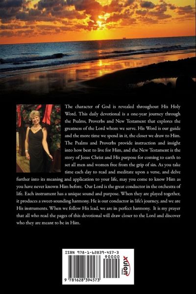 The character of God is revealed throughout His Holy Word. This daily devotional is a one-year journey through the Psalms, Proverbs and New Testament that explores the greatness of the Lord whom we serve. His Word is our guide and the more time we spend in it, the closer we draw to Him. The Psalms and Proverbs provide instruction and insight into how best to live for Him, and the New Testament is the story of Jesus Christ and His purpose for coming to earth to set all men and women free from the grip of sin. As you take time each day to read and meditate upon a verse, and delve further into its meaning and application to your life, may you come to know Him as you have never known Him before. Our Lord is the great conductor in the orchestra of life. Each instrument has a unique sound and purpose. When they are played together, it produces a sweet-sounding harmony. He is our conductor in life's journey, and we are His instruments. When we follow His lead, we are in perfect harmony. It is my prayer that all who read the pages of this devotional will draw closer to the Lord and discover who they are meant to be in Him.