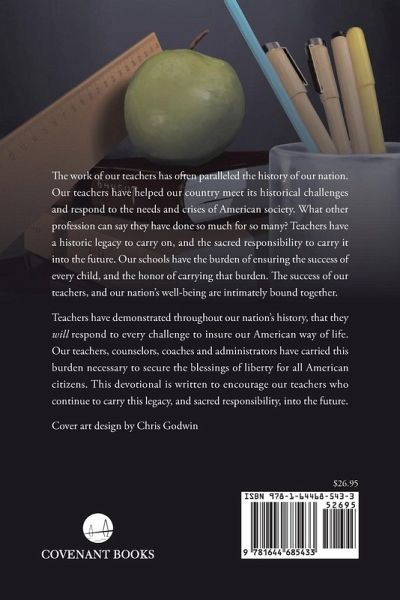 The work of our teachers has often paralleled the history of our nation. Our teachers have helped our country meet its historical challenges and respond to the needs and crises of American society. What other profession can say they have done so much for so many? Teachers have a historic legacy to carry on, and the sacred responsibility to carry it into the future. Our schools have the burden of ensuring the success of every child, and the honor of carrying that burden. The success of our teachers, and our nation's well-being are intimately bound together. Teachers have demonstrated throughout our nation's history, that they will respond to every challenge to insure our American way of life. Our teachers, counselors, coaches and administrators have carried this burden necessary to secure the blessings of liberty for all American citizens. This devotional is written to encourage our teachers who continue to carry this legacy, and sacred responsibility, into the future.