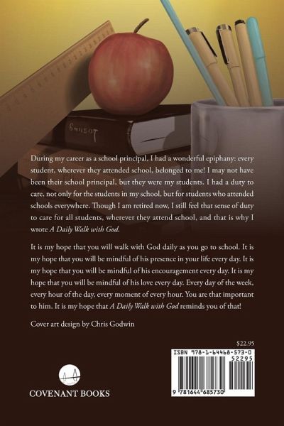 During my career as a school principal, I had a wonderful epiphany: every student, wherever they attended school, belonged to me! I may not have been their school principal, but they were my students. I had a duty to care, not only for the students in my school, but for students who attended schools everywhere. Though I am retired now, I still feel that sense of duty to care for all students, wherever they attend school, and that is why I wrote A Daily Walk with God. It is my hope that you will walk with God daily as you go to school. It is my hope that you will be mindful of his presence in your life every day. It is my hope that you will be mindful of his encouragement every day. It is my hope that you will be mindful of his love every day. Every day of the week, every hour of the day, every moment of every hour. You are that important to him. It is my hope that A Daily Walk with God reminds you of that!