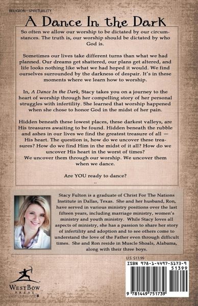 So often we allow our worship to be dictated by our circumstances. The truth is, our worship should be dictated by who God is. Sometimes our lives take different turns than what we had planned. Our dreams get shattered, our plans get altered, and life looks nothing like what we had hoped it would. We find ourselves surrounded by the darkness of despair. It's in these moments where we learn how to worship. In, A Dance In the Dark, Stacy takes you on a journey to the heart of worship through her compelling story of her personal struggles with infertility. She learned that worship happened when she chose to honor God in the midst of her pain. Hidden beneath these lowest places, these darkest valleys, are His treasures awaiting to be found. Hidden beneath the rubble and ashes in our lives we find the greatest treasure of all -- His heart. The question is, how do we uncover these treasures? How do we find Him in the midst of it all? How do we uncover His heart in the worst of times? We uncover them through our worship. We uncover them when we dance. Are YOU ready to dance?