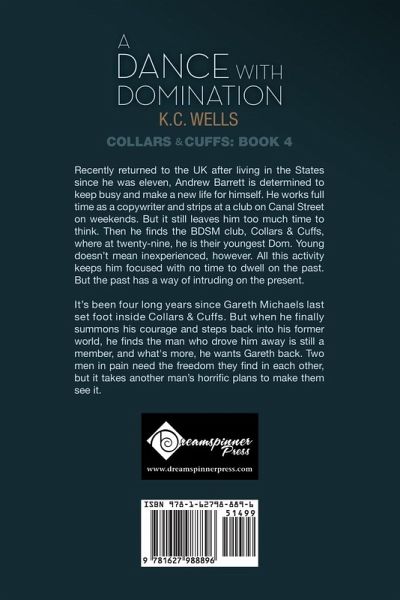 Collars and Cuffs: Book Four Recently returned to the UK after living in the States since he was eleven, Andrew Barrett is determined to keep busy and make a new life for himself. He works full time as a copywriter and strips at a club on Canal Street on weekends. But it still leaves him too much time to think. Then he finds the BDSM club, Collars & Cuffs, where at twenty-nine, he is their youngest Dom. Young doesn't mean inexperienced, however. All this activity keeps him focused with no time to dwell on the past. But the past has a way of intruding on the present. It's been four long years since Gareth Michaels last set foot inside Collars & Cuffs. But when he finally summons his courage and steps back into his former world, he finds the man who drove him away is still a member, and what's more, he wants Gareth back. Two men in pain need the freedom they find in each other, but it takes another man's horrific plans to make them see it.