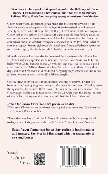 First book in the eagerly anticipated sequel to the Bellamys of Texas trilogy! Fast-forwarding a few generations finds the contemporary Bellamy-Welles-Slade families going strong in northern New Mexico. Colter Bellamy and his partner, Jonah Slade, run the security division of the family business in Albuquerque, including private investigation and personal security services. When they get the call that J.D. Pederson's death was suspicious, Colter rushes to northern New Mexico, the area near his own family's ranch, to see how he can aid in the investigation. When he discovers that the blown tire and rollover were no accident, everyone associated with the Pederson Ranch becomes a suspect. Twenty-eight year old, hazel-eyed Miranda Pederson seems the most broken up by the death, but she's also the one with the most to gain. Miranda is shocked to learn she has inherited the lucrative ranch. J.D. was her stepfather and she expected his natural sons, nine-year-old twins, would be the heirs. When Colter Bellamy shows up with his suspicious questions and a good-sized dose of the Bellamy charm, she doesn't know what to think. But within days, someone fires shots at Miranda and her young stepbrothers, and she knows all their lives are at risk, unless J.D.'s killer is caught. One by one, Colter checks out the suspects, wanting to believe in Miranda's innocence and to ignore how good she looks in those jeans. Can they resist the sparks that fly between them, even if it turns out Miranda is a suspect and Colter might be the one to turn her in? Or will Miranda learn the deepest secrets of the Bellamy family and discover betrayals that shock her to the core? Praise for Susan Yawn Tanner's Bellamys of Texas series: "Non-stop Western action combined with a passionate love story. Five breathless stars!!" -Sue's Reviews online "I love the story line of this book. Very well written. Author does a great job making you feel like you are in the book!" - Lisa Armand, 5 stars, Amazon "Great book! This book is about love; love for family, love for your child, first love, lost love, and true love." - SKM, 5 stars, online review "A journey to the past ... fast paced, intriguing, action packed and romantic!" - Carol LaGatta, 5 stars, online review "So happy Book 2 of The Bellamys of Texas was released. The story of Jeb, a Texas Ranger, and Hannah, a preacher's young widow who wants to avenge her husband and her unborn child's death, is an awesome read." - Janice, 5 stars on Amazon "Wonderful! This book has it all -- action, romance, lawmen, outlaws, and vivid character descriptions, all woven together in a believable story." - 5 stars on Amazon (for Fire Across Texas)