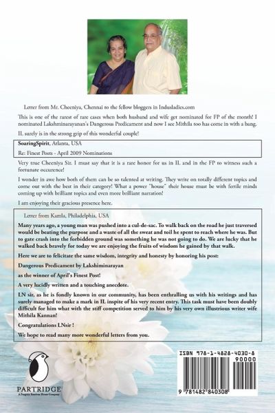 About the authors Mythili and Lakshminarayanan (SLN as he is affectionately nicknamed) were married in the year 1970. After forty years of togetherness, raising a family with two independent minded daughters, Mythili passed on in 2011 leaving her husband to continue captaining their ship. Their relationship was peppered with intellectual pursuits, a shared love for writing, voracious reading, strong political convictions and so much more. Mythili was diagnosed with a chronic lung disorder and her husband fought against God and destiny to save her but it was not to be. With oxygen machines and ventilators strapped on 24 hours, Mythili continued to write with passion, encouraged and supported by SLN whom she always described as 'my friend, philosopher and guide'. Her writings centre on the Indian family, love and the famous Indian quality of ádjustment'. SLN with over forty years' experience in fertiliser marketing, retired in 1997 as vice president Commercial of a big industrial group in India. He has been an active blogger since retirement. Born the eldest of ten children in a yet to be liberated India, SLN has played the roles of a responsible son and protective elder brother with aplomb but it was with Mythili's serene companionship that he achieved his best in life. This collection of stories and articles reflect decades of life experiences that will enrich the mind and provide delightful and touching glimpses of a modern yet traditional India. It is a salute from a husband to his cherished wife.