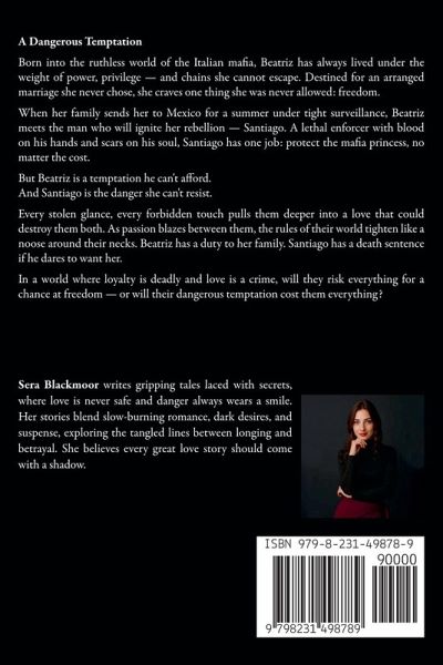 A Dangerous Temptation Born into the ruthless world of the Italian mafia, Beatriz has always lived under the weight of power, privilege - and chains she cannot escape. Destined for an arranged marriage she never chose, she craves one thing she was never allowed: freedom. When her family sends her to Mexico for a summer under tight surveillance, Beatriz meets the man who will ignite her rebellion - Santiago. A lethal enforcer with blood on his hands and scars on his soul, Santiago has one job: protect the mafia princess, no matter the cost. But Beatriz is a temptation he can't afford. And Santiago is the danger she can't resist. Every stolen glance, every forbidden touch pulls them deeper into a love that could destroy them both. As passion blazes between them, the rules of their world tighten like a noose around their necks. Beatriz has a duty to her family. Santiago has a death sentence if he dares to want her. In a world where loyalty is deadly and love is a crime, will they risk everything for a chance at freedom - or will their dangerous temptation cost them everything?