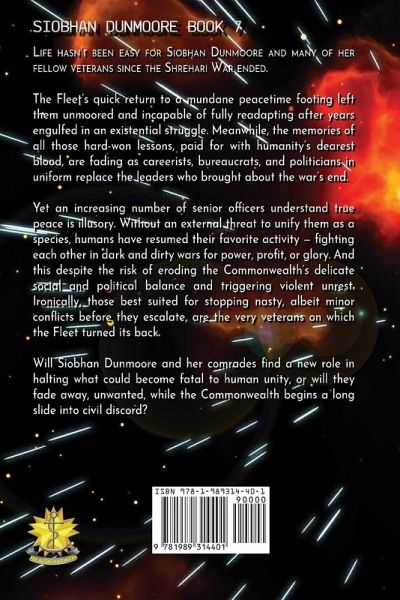 Life hasn't been easy for Siobhan Dunmoore and many of her fellow veterans since the Shrehari War ended. The Fleet's quick return to a mundane peacetime footing left them unmoored and incapable of fully readapting after years engulfed in an existential struggle. Meanwhile, the memories of all those hard-won lessons, paid for with humanity's dearest blood, are fading as careerists, bureaucrats, and politicians in uniform replace the leaders who brought about the war's end. Yet an increasing number of senior officers understand true peace is illusory. Without an external threat to unify them as a species, humans have resumed their favorite activity - fighting each other in dark and dirty wars for power, profit, or glory. And this despite the risk of eroding the Commonwealth's delicate social and political balance and triggering violent unrest. Ironically, those best suited for stopping nasty, albeit minor conflicts before they escalate, are the very veterans on which the Fleet turned its back. Will Siobhan Dunmoore and her comrades find a new role in halting what could become fatal to human unity, or will they fade away, unwanted, while the Commonwealth begins a long slide into civil discord?