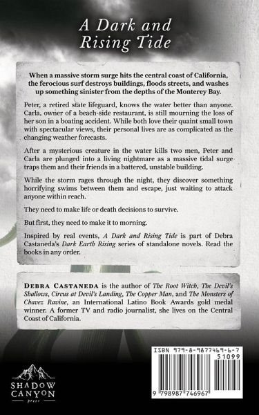 When a massive storm surge hits the central coast of California, the ferocious surf destroys buildings, floods streets, and washes up something sinister from the depths of the Monterey Bay. Peter, a retired state lifeguard, knows the water better than anyone. Carla, owner of a beach-side restaurant, is still mourning the loss of her son in a boating accident. While both love their quaint small town with spectacular views, their personal lives are as complicated as the changing weather forecasts. After a mysterious creature in the water kills two men, Peter and Carla are plunged into a living nightmare as a massive tidal surge traps them and their friends in a battered, unstable building. While the storm rages through the night, they discover something horrifying swims between them and escape, just waiting to attack anyone within reach. They need to make life or death decisions to survive. But first, they need to make it to morning. Inspired by real events, A Dark and Rising Tide is part of Debra Castaneda's Dark Earth Rising series of standalone novels. Read the books in any order.