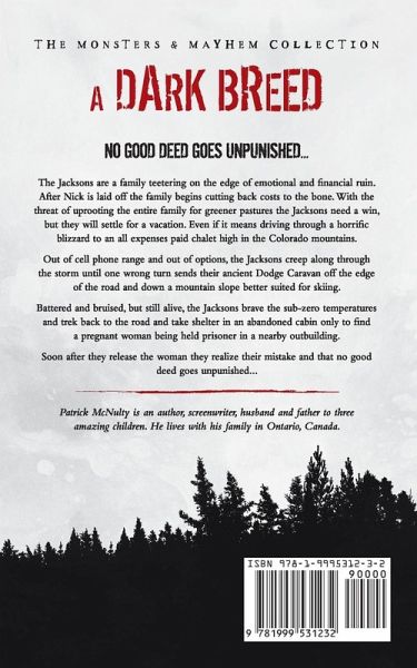 No good deed goes unpunished... Nick Jacksons family is teetering on the edge of emotional and financial ruin. With the threat of uprooting his entire family for greener pastures Nick needs a win, but he'll settle for a vacation. Even if it means driving through a horrific blizzard to an all expenses paid cabin in the Colorado mountains. Out of cell phone range and out of options, Nick and his family creep along through the storm until one wrong turn sends their ancient Dodge Caravan off the edge of the road and down a mountain slope better suited for skiing. Battered and bruised, but still alive, Nick leads his family to shelter in an abandoned cabin only to find a pregnant woman being held prisoner in a nearby outbuilding. Soon after he releases the woman he realizes his mistake and that no good deed goes unpunished... A Dark Breed is the terrifying first book in the Monsters & Mayhem Collection. If you like reading about families, friends and lovers forced to survive supernaturally horrific events then you'll love Patrick McNulty's frightening tales. Buy A DARK BREED and step into the darkness today!