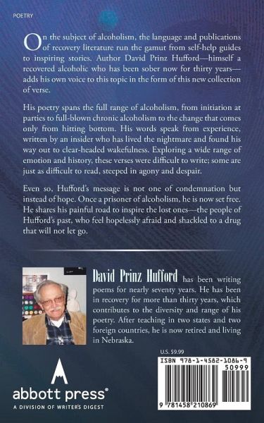 On the subject of alcoholism, the language and publications of recovery literature run the gamut from self-help guides to inspiring stories. Author David Prinz Hufford—himself a recovered alcoholic who has been sober now for thirty years—adds his own voice to this topic in the form of this new collection of verse. His poetry spans the full range of alcoholism, from initiation at parties to full-blown chronic alcoholism to the change that comes only from hitting bottom. His words speak from experience, written by an insider who has lived the nightmare and found his way out to clear-headed wakefulness. Exploring a wide range of emotion and history, these verses were difficult to write; some are just as difficult to read, steeped in agony and despair. Even so, Hufford’s message is not one of condemnation but instead of hope. Once a prisoner of alcoholism, he is now set free. He shares his painful road to inspire the lost ones—the people of Hufford’s past, who feel hopelessly afraid and shackled to a drug that will not let go.