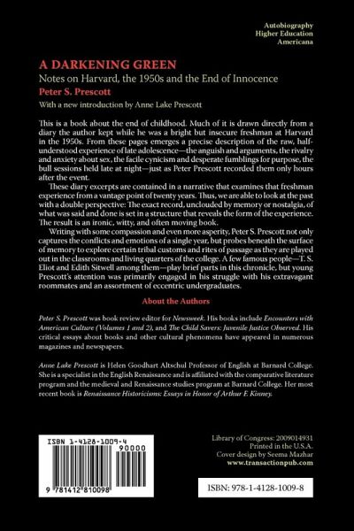 This is a book about the end of childhood. Much of it is drawn directly from a diary the author kept while he was a bright but insecure freshman at Harvard in the 1950s. From these pages emerges a precise description of the raw, half-understood experience of late adolescence-the anguish and arguments, the rivalry and anxiety about sex, the facile cynicism and desperate fumblings for purpose, the bull sessions held late at night-just as Peter Prescott recorded them only hours after the event. These diary excerpts are contained in a narrative that examines that freshman experience from a vantage point of twenty years. Thus, we are able to look at the past with a double perspective: The exact record, unclouded by memory or nostalgia, of what was said and done is set in a structure that reveals the form of the experience. The result is an ironic, witty, and often moving book. Writing with some compassion and even more asperity, Peter S. Prescott not only captures the conflicts and emotions of a single year, but probes beneath the surface of memory to explore certain tribal customs and rites of passage as they are played out in the classrooms and living quarters of the college. A few famous people-T. S. Eliot and Edith Sitwell among them-play brief parts in this chronicle, but young Prescott's attention was primarily engaged in his struggle with his extravagant roommates and an assortment of eccentric undergraduates.