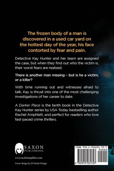 The frozen body of a man is discovered in a used car yard on the hottest day of the year, his face contorted by fear and pain. Detective Kay Hunter and her team are assigned the case, but when they find out who their victim is, their worst fears are realised. There is another man missing - but is he a victim, or a killer? With time running out and witnesses afraid to talk, Kay is thrust into one of the most challenging investigations of her career to date. A Darker Place is the tenth book in the Detective Kay Hunter series by USA Today bestselling author Rachel Amphlett, and perfect for readers who love fast-paced crime thrillers.