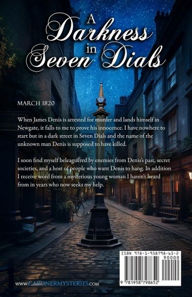 March 1820 When James Denis is arrested for murder and lands himself in Newgate, it falls to me to prove his innocence. I have nowhere to start but in a dark street in Seven Dials and the name of the unknown man Denis is supposed to have killed. I soon find myself beleaguered by enemies from Denis's past, secret societies, and a host of people who want Denis to hang. In addition I receive word from a mysterious young woman I haven't heard from in years who now seeks my help.