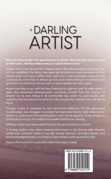 She's alone by design. He's spontaneous to a fault. With the door about to shut on their past, will they rediscover joy in each other's arms? Alaska. Grace Hart guards her independence fiercely. Leaving a marriage that left her unfulfilled, the thirty-nine-year-old maintains a quiet existence off the beaten path running a coffee shop with only a mini-Australian shepherd for company. So when her ex shows up two years later looking to reconnect, she gives him one month to win her over or never darken her days again. Hunter Hart likes to go with the flow. Denying his sadness over his wife calling it quits, the renowned photographer convinces himself that the chance to answer to no one makes it all worthwhile. But when his best buddy dies suddenly, the first person he turns to is the empathetic woman who still fills his heart. Though Grace is surprised by her newfound affection for the gray-eyed heartbreaker, she struggles to protect her hard-won liberty. And while Hunter begins to understand that putting down roots has its appeal, he has a fight on his hands proving to the stubborn brunette that he can change. Will they make their peace and find that the second time's a charm? A Darling Artist is the warm-hearted third book in the Darling Men Alaskan small-town romance series. If you like strong heroines, rekindled sparks, and personal enlightenment, you'll adore Lark Holiday's picture-perfect tale. Buy A Darling Artist to just add cream and sugar today!