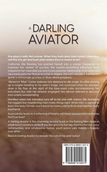 She plays it safe. He's a loner. When they both deny their instant chemistry, will this city girl and bush pilot realize they're meant to be? California. Elle Blessing has painted herself into a corner. Desperate to maintain her veneer of success, the twenty-something influencer feels trapped in her miserable job and mostly platonic relationship. And when she reluctantly joins her fiancé on a trip to Alaska, she can't decide if their hunky guide is annoyingly grumpy or drop-dead gorgeous. Maverick "Mac" Carter believes he's destined to die single. So after picking up a couple heading to his sister's lodge, he's surprised when his stomach does a flip flop at the sight of the blue-eyed cutie accompanying her betrothed. But with her already engaged, he's almost relieved to discover she's utterly exasperating. Horrified when her intended runs off to be one with nature, Elle demands the rugged but maddening man make things right. While Mac is aghast to learn the feisty female won't leave his home until he finds and fixes her nutty boyfriend. As proximity leads to a softening of hearts, will these unexpected soulmates find true love? A Darling Aviator is the charming second book in the Darling Men Alaskan small-town romance series. If you like grouchy but big-hearted heroes, cozy communities, and wholesome humor, you'll adore Lark Holiday's happily ever after. Buy A Darling Aviator to answer the call of the wild today!