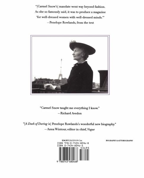 Carmel Snow, who changed the course of our culture by launching the careers of some of today's greatest figures in fashion and the arts, was one of the most extraordinary women of the twentieth century. As editor in chief of Harper's Bazaar from 1934 to 1958 she championed the concept of "a well-dressed magazine for the well-dressed mind," bringing cutting-edge art, fiction, photography, and reportage into the American home. Now comes A Dash of Daring, a first and definitive biography of this larger-than-life figure in publishing, art, and letters. Veteran magazine journalist Penelope Rowlands describes the remarkable places Snow frequented and the people whose lives she transformed, among them Richard Avedon, Diana Vreeland, Geoffrey Beene, Henri Cartier-Bresson, Cristobal Balenciaga, Lauren Bacall, and Truman Capote. She chronicles Snow's life on both sides of the Atlantic, beginning in nineteenth-century Ireland and continuing to Paris, Milan, and New York City, the fashion capitals of the world. Snow was the daughter of an Irish immigrant, who was herself a forward-thinking businesswoman, and she worked in her mother's custom dressmaking shop before being discovered by the magazine publisher Conde Nast and training under Edna Woolman Chase, the famous longtime editor of Vogue. From there it was on to Harper's Bazaar which, with the help of such key employees as Avedon, Vreeland, and art director Alexei Brodovitch, Snow turned into the most admired magazine of the century. Among the disparate talents who worked at Bazaar in the Snow era were Andy Warhol, the heiress Doris Duke, Maeve Brennan, and members of the storied Algonquin Round Table. Overflowing with previously untold stories of the colorful and glamorous, A Dash of Daring is a compelling portrait of the fashion world during a golden era.