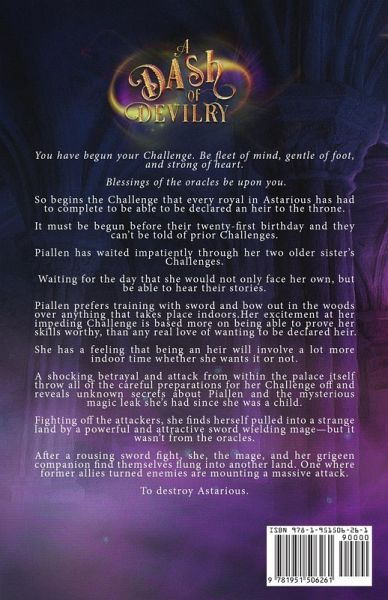 You have begun your Challenge. Be fleet of mind, gentle of foot, and strong of heart. Blessings of the oracles be upon you.So begins the Challenge that every royal in Astarious has had to complete to be able to be declared an heir to the throne.It must be begun before their twenty-first birthday and they can't be told of prior Challenges.Piallen has waited impatiently through her two older sister's Challenges. Waiting for the day that she would not only face her own, but be able to hear their stories.Piallen prefers training with sword and bow out in the woods over anything that takes place indoors. Her excitement at her impeding Challenge is based more on being able to prove her skills worthy, than any real love of wanting to be declared heir. She has a feeling that being an heir will involve a lot more indoor time whether she wants it or not.A shocking betrayal and attack from within the palace itself throw all of the careful preparations for her Challenge off and reveals unknown secrets about Piallen and the mysterious magic leak she's had since she was a child.Fighting off the attackers, she finds herself pulled into a strange land by a powerful and attractive sword wielding mage-but it wasn't from the oracles.After a rousing sword fight, she, the mage, and her grigeen companion find themselves flung into another land. One where former allies turned enemies are mounting a massive attack.To destroy Astarious.