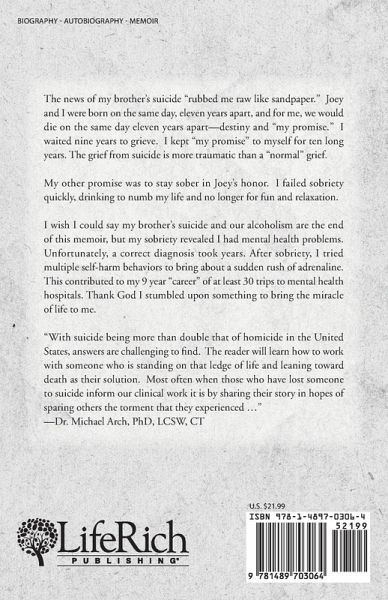 The news of my brother's suicide "rubbed me raw like sandpaper." Joey and I were born on the same day, eleven years apart, and for me, we would die on the same day eleven years apart-destiny and "my promise." I waited nine years to grieve. I kept "my promise" to myself for ten long years. The grief from suicide is more traumatic than a "normal" grief. My other promise was to stay sober in Joey's honor. I failed sobriety quickly, drinking to numb my life and no longer for fun and relaxation. I wish I could say my brother's suicide and our alcoholism are the end of this memoir, but my sobriety revealed I had mental health problems. Unfortunately, a correct diagnosis took years. After sobriety, I tried multiple self-harm behaviors to bring about a sudden rush of adrenaline. This contributed to my 9 year "career" of at least 30 trips to mental health hospitals. Thank God I stumbled upon something to bring the miracle of life to me. "With suicide being more than double that of homicide in the United States, answers are challenging to find. The reader will learn how to work with someone who is standing on that ledge of life and leaning toward death as their solution. Most often when those who have lost someone to suicide inform our clinical work it is by sharing their story in hopes of sparing others the torment that they experienced ..." -Dr. Michael Arch, PhD, LCSW, CT