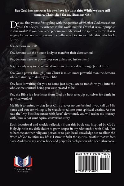 But God demonstrates his own love for us in this: While we were still sinners, Christ died for us. (Romans 5:8) Do you find yourself struggling with the question of whether God cares about you? Or does your existence in this world matter? Or what is your purpose in this world? If you have a deep desire to understand the spiritual battle that is waging for you not to experience the fullness of God in your life, this is the book for you. Yes, demons are real! Yes, demons use the human body to manifest their destruction! Yes, demons have no power over you unless you invite them! Yes, the only way to overcome demons in this world is through Jesus Christ! Yes, God's power through Jesus Christ is much more powerful than the demons who are striving to destroy your life! Yes, Jesus is waiting for you to come just as you are to transform you into the wholesome spiritual being you were created to be! Yes, the Bible is a love letter from God on how to equip ourselves for battle in spiritual warfare! My life is a testimony that Jesus Christ leaves no one behind if you call on His name and you are willing to be transformed into your spiritual destiny. As you read the "My First Encounter with Jesus" devotional, you will realize my journey with Jesus is not your typical conversion story. Each devotional and weekly reflection from this book was inspired by God's Holy Spirit in my daily desire to grow deeper in my relationship with God. Not to become another religious person or to gain head knowledge but to allow the Word of God to infuse my life as I strive to fight the spiritual warfare that we face daily. And that is my sincere hope and prayer for each person who opens this book.