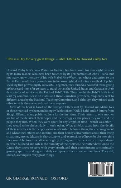 'This is a Day for very great things.' - 'Abdu'l-Bahá to Howard Colby Ives Howard Colby Ives's book Portals to Freedom has been loved for over eight decades by its many readers who have been touched by its pen portraits of 'Abdu'l-Bahá. But not many know the story of his wife Mabel Rice-Wray Ives, whose dedication to the Bahá'í Faith made her a powerhouse in her own right, developing a method of public speaking that proved highly successful. Together, they formed a powerful team, giving up house and home for 20 years to travel across the United States and Canada in their desire to be of service to the Faith of Bahá'u'lláh. They taught the Bahá'í Faith in at least 74 communities in 26 states and three Canadian provinces, frequently sent to different areas by the National Teaching Committee, and although they missed each other terribly they never refused these requests. Most of this book is based on the over 900 letters sent by Howard and Mabel Ives or those received by them, including 17 Tablets from 'Abdu'l-Bahá and 28 letters from Shoghi Effendi, many published here for the first time. Their letters to one another are full of the details of their hopes and their struggles, the places they went and the people they met. When they were apart for any length of time - which was often - they would write almost daily to each other. What unfolds, apart from the details of their activities, is the deeply loving relationship between them, the encouragement and advice they offered one another, and their homey conversations about their living situations, money (always in short supply), and expressions of hope for the next time they would be together. Woven brightly throughout this personal correspondence between husband and wife is the humility of their service, their utter devotion to the Cause they strove to serve with every breath, and their commitment to continually growing spiritually along with daily examples of their constant sacrifices. They did, indeed, accomplish 'very great things'.