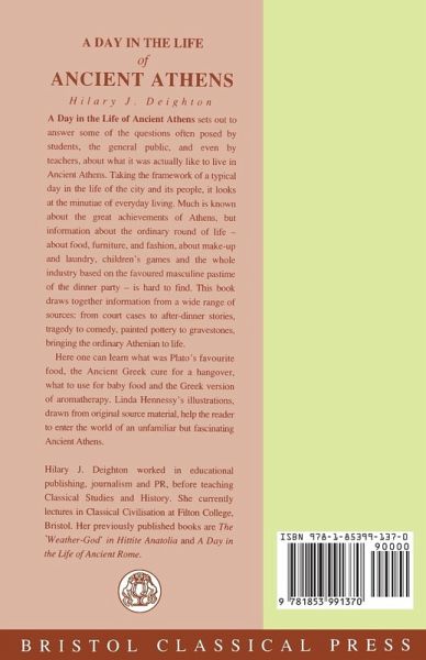 Drawing together information from a wide range of sources: - from court cases to after-dinner stories, tragedy to comedy, painted pottery to gravestones - this book brings the ordinary Athenian to life. Taking the framework of a typical day in the life of the city and its people, it looks at the minutiae of everyday living. Much is known about the great achievements of Athens, but information about the ordinary round of life - about food, furniture, and fashion, about make-up and laundry, children's games and the whole industry based on the favoured masculine pastime of the dinner party - is hard to find. To give an idea of what it was actually like to live in Ancient Athens, the book reveals Plato's favourite food; the Ancient Greek cure for a hangover; what to use for baby food and the Greek version of aromatherapy. Linda Hennessy's illustrations, drawn from original source material, help the reader to enter the window of the unfamiliar but fascinating ancient Athens.
