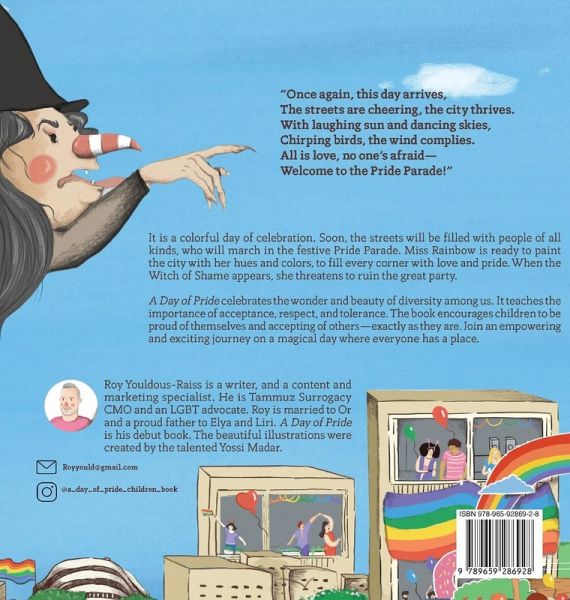 Are you interested in teaching your kid the beauty of diversity and differences among us? Do you believe in LGBTQ rights and equality for all? A Day of Pride is the perfect children's book for you and your kid! It is a colorful day of celebration. Soon, the streets will be filled with people of all kinds, who will march in the festive Pride Parade. Miss Rainbow is ready to paint the city with her hues and colors, to fill every corner with love and pride. When the Witch of Shame appears, she threatens to ruin the great party. Celebrating the unique day of Pride Parade, A Day of Pride teaches the importance of acceptance and tolerance. It encourages children of all kind to be proud of themselves and accepting of others-exactly as they are. Invite your kid to an empowering and exciting journey on a magical day where everyone has a place. Main themes in the book: ¿ Diversity and inclusion! ¿ Pride and LGBT people ¿ Anti-Bullying ¿ Self-esteem ¿ Tolerance and acceptance ¿ Gender identity ¿ Rainbow families ¿ Being different ¿ Social skills Roy Youldous-Raiss is a writer, and a content and marketing specialist. He is Tammuz Surrogacy CMO and an LGBT advocate. Roy is married to Or and a proud father to Elya and Liri. A Day of Pride is his debut book. The beautiful illustrations were created by the talented Yossi Madar.
