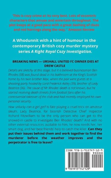 Will their differences drive a wedge between them or can Lady Beatrice and DCI Fitzwilliam join forces to catch a killer before it's too late?BREAKING NEWS Urshall United FC Owner Dies at Drew Castle Details are sketchy at this stage, but it is believed businessman Ben Rhodes (38) was found dead in his bathroom at the King's Scottish home by his twin brother Max, where the pair were guests at a shooting party hosted by Lord Frederick Astley (39), brother of Lady Beatrice (36). The cause of Mr Rhodes' death is not known, but he started receiving death threats from football fans after his controversial takeover of the club and had recently employed his own personal security. How unlucky can a girl get? Is fate playing a cruel trick on amateur sleuth, Lady Beatrice, for boorish Detective Chief Inspector Richard Fitzwilliam to be the only person who can get to the snowed-in castle to investigate Ben Rhodes' death? And with no other external resources available to him, he now needs her, her smart dog, and her best friends' help to catch the killer. Can they put their issues behind them and work together to find the murderer before the weather improves and the perpetrator is free to leave? A page-turning, contemporary, clean, British cozy whodunnit with a hint of humour that you wouldn't be able to put down.