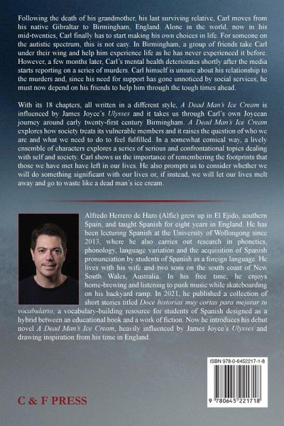Following the death of his grandmother, his last surviving relative, Carl moves from his native Gibraltar to Birmingham, England. Alone in the world, now in his mid-twenties, Carl finally has to start making his own choices in life. For someone on the autistic spectrum, this is not easy. In Birmingham, a group of friends take Carl under their wing and help him experience life as he has never experienced it before. However, a few months later, Carl's mental health deteriorates shortly after the media starts reporting on a series of murders. Carl himself is unsure about his relationship to the murders and, since his need for support has gone unnoticed by social services, he must now depend on his friends to help him through the tough times ahead. With its 18 chapters, all written in a different style, A Dead Man's Ice Cream is influenced by James Joyce's Ulysses and it takes us through Carl's own Joycean journey around early twenty-first century Birmingham. A Dead Man's Ice Cream explores how society treats its vulnerable members and raises questions about who we are and what we need to do to feel fulfilled. In a somewhat comical way, a lively ensemble of characters explores a series of serious and confrontational topics dealing with self and society. Carl shows us the importance of remembering the footprints that those we have met have left in our lives. He also prompts us to consider whether we will do something significant with our lives or, if instead, we will let our lives melt away and go to waste like a dead man's ice cream.