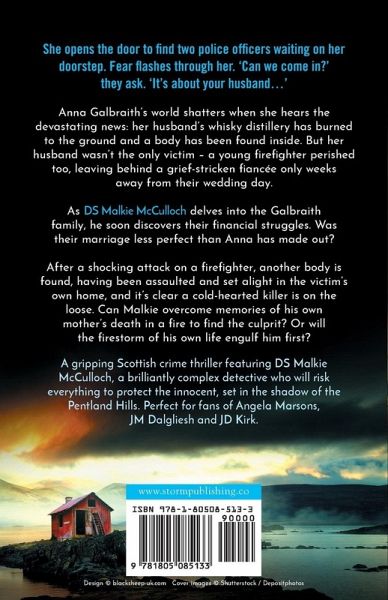 She opens the door to find two police officers waiting on her doorstep. Fear flashes through her. 'Can we come in?' they ask. 'It's about your husband...' Anna Galbraith's world shatters when she hears the devastating news: her husband's whisky distillery has burned to the ground and a body has been found inside. But her husband wasn't the only victim - a young firefighter perished too, leaving behind a grief-stricken fiancée only weeks away from their wedding day. As DS Malkie McCulloch delves into the Galbraith family, he soon discovers their financial struggles. Was their marriage less perfect than Anne has made out? After a shocking attack on a firefighter, another body is found, assaulted and set alight in the victim's own home, and it's clear a frenzied killer is on the loose. Can Malkie overcome memories of his own mother's death in a fire to find the culprit? Or will the firestorm of his own life engulf him first? A gripping Scottish crime thriller featuring DS Malkie McCulloch, a brilliantly complex detective who will risk everything to protect the innocent, set in the shadow of the Pentland Hills. Perfect for fans of Angela Marsons, JM Dalgliesh and JD Kirk.