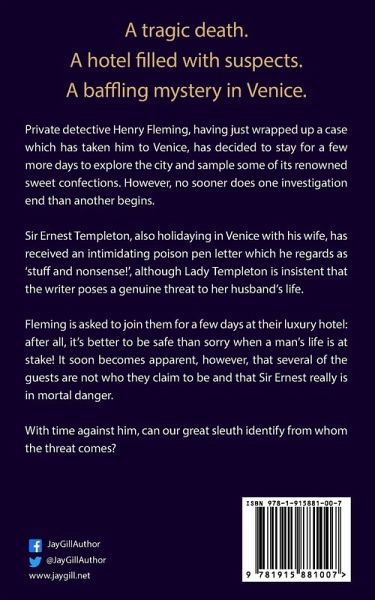 A tragic death. A hotel filled with suspects. A baffling mystery in Venice. Private detective Henry Fleming, having just wrapped up a case which has taken him to Venice, has decided to stay for a few more days to explore the city and sample some of its renowned sweet confections. However, no sooner does one investigation end than another begins. Sir Ernest Templeton, also holidaying in Venice with his wife, has received an intimidating poison pen letter which he regards as 'stuff and nonsense!', although Lady Templeton is insistent that the writer poses a genuine threat to her husband's life. Fleming is asked to join them for a few days at their luxury hotel: after all, it's better to be safe than sorry when a man's life is at stake! It soon becomes apparent, however, that several of the guests are not who they claim to be and that Sir Ernest really is in mortal danger. With time against him, can our great sleuth identify from whom the threat comes? For fans of Poirot, Miss Marple, Columbo, Jessica Fletcher and all their wonderful whodunnit / howdunnit mysteries. Clean read: no graphic violence, bedroom shenanigans, or strong language.