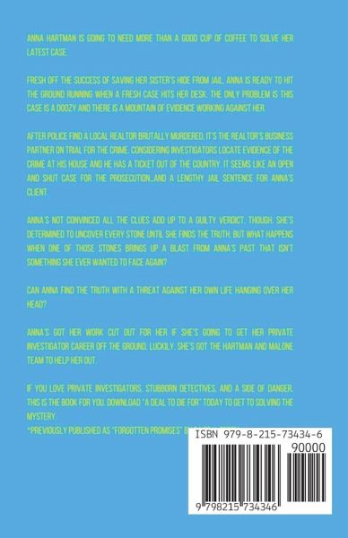 Anna Hartman is going to need more than a good cup of coffee to solve her latest case. Fresh off the success of saving her sister's hide from jail, Anna is ready to hit the ground running when a fresh case hits her desk. The only problem is this case is a doozy and there is a mountain of evidence working against her. After police find a local realtor brutally murdered, it's the realtor's business partner on trial for the crime. Considering investigators locate evidence of the crime at his house and he has a ticket out of the country, it seems like an open and shut case for the prosecution…and a lengthy jail sentence for Anna's client. Anna's not convinced all the clues add up to a guilty verdict, though. She's determined to uncover every stone until she finds the truth. But what happens when one of those stones brings up a blast from Anna's past that isn't something she ever wanted to face again? Can Anna find the truth with a threat against her own life hanging over her head? Anna's got her work cut out for her if she's going to get her private investigator career off the ground. Luckily, she's got the Hartman and Malone team to help her out. If you love private investigators, stubborn detectives, and a side of danger, this is the book for you. Download "A Deal to Die For" today to get to solving the mystery. *Previously published as "Forgotten Promises" by Paige H. Perry