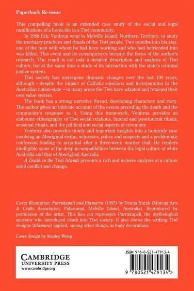 This compelling book is an extended case study of the social and legal ramifications of a homicide in a Tiwi community. The author gives a detailed account of the life of the victim and the events surrounding his murder, and describes the cycle of mortuary and seasonal rituals with their elaborate songs and dances. He also looks at the dramatic changes in Tiwi society over the last 100 years, and examines how the Tiwi have responded to the intervention of Western culture. In many areas, he finds, they have adapted and retained their own value system. Venbrux's account of the investigation and trial following the homicide provides timely and important insights into the issue of Aboriginal People, traditional law and the Australian criminal justice system. Through the strong narrative thread of this book we are presented with an incisive picture of a culture amid conflict and change.