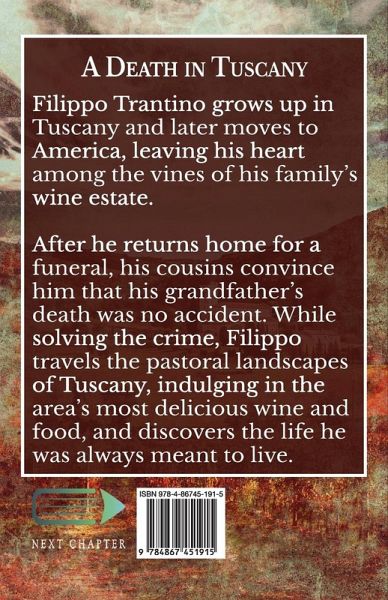 "As much a crime novel as an authoritative travelogue and wine tutorial... an enjoyable read for Tuscany aficionados in particular." - Ambassador Magazine Filippo Trantino grows up in Tuscany and later moves to America, leaving his heart among the vines of his family's wine estate. After he returns home for a funeral, his cousins convince him that his grandfather's death was no accident. While solving the crime, Filippo travels the pastoral landscapes of Tuscany, indulging in the area's most delicious wine and food, and discovers the life he was always meant to live.