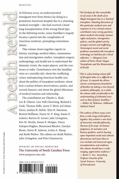 In February 2003, an undocumented immigrant teen from Mexico lay dying in a prominent American hospital due to a stunning medical oversight — she had received a heart-lung transplantation of the wrong blood type. In the following weeks, Jesica Santillan’s tragedy became a portal into the complexities of American medicine, prompting contentious debate about new patterns and old problems in immigration, the hidden epidemic of medical error, the lines separating transplant “haves” from “have-nots,” the right to sue, and the challenges posed by “foreigners” crossing borders for medical care. This volume draws together experts in history, sociology, medical ethics, communication and immigration studies, transplant surgery, anthropology, and health law to understand the dramatic events, the major players, and the core issues at stake. Contributors view the Santillan story as a morality tale: about the conflicting values underpinning American health care; about the politics of transplant medicine; about how a nation debates deservedness, justice, and second chances; and about the global dilemmas of medical tourism and citizenship. Contributors: Charles Bosk, University of Pennsylvania Leo R. Chavez, University of California, Irvine Richard Cook, University of Chicago Thomas Diflo, New York University Medical Center Jason Eberl, Indiana University–Purdue University Indianapolis Jed Adam Gross, Yale University Jacklyn Habib, American Association of Retired Persons Tyler R. Harrison, Purdue University Beatrix Hoffman, Northern Illinois University Nancy M. P. King, University of North Carolina at Chapel Hill Barron Lerner, Columbia University Mailman School of Public Health Susan E. Lederer, Yale University Julie Livingston, Rutgers University Eric M. Meslin, Indiana University School of Medicine and Indiana University–Purdue University Indianapolis Susan E. Morgan, Purdue University Nancy Scheper-Hughes, University of California, Berkeley Rosamond Rhodes, Mount Sinai School of Medicine and The Graduate Center, City University of New York Carolyn Rouse, Princeton University Karen Salmon, New England School of Law Lesley Sharp, Barnard and Columbia University Mailman School of Public Health Lisa Volk Chewning, Rutgers University Keith Wailoo, Rutgers University