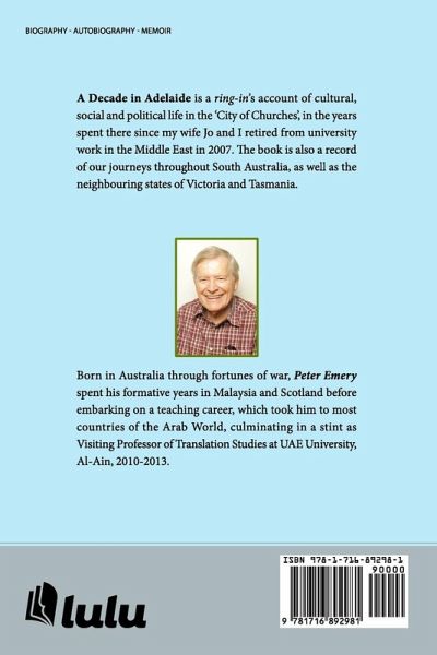 A Decade in Adelaide is a ring-in's account of cultural, social and political life in the 'City of Churches', in the years spent there since my wife Jo and I retired from university work in the Middle East in 2007. The book is also a record of our journeys throughout South Australia, as well as the neighbouring states of Victoria and Tasmania.