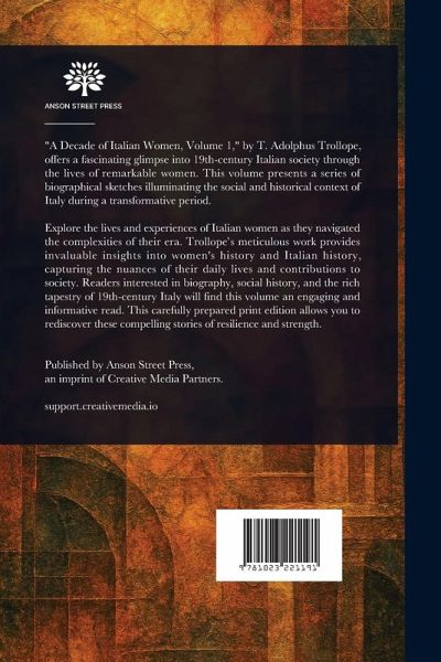 "A Decade of Italian Women, Volume 1," by T. Adolphus Trollope, offers a fascinating glimpse into 19th-century Italian society through the lives of remarkable women. This volume presents a series of biographical sketches illuminating the social and historical context of Italy during a transformative period. Explore the lives and experiences of Italian women as they navigated the complexities of their era. Trollope's meticulous work provides invaluable insights into women's history and Italian history, capturing the nuances of their daily lives and contributions to society. Readers interested in biography, social history, and the rich tapestry of 19th-century Italy will find this volume an engaging and informative read. This carefully prepared print edition allows you to rediscover these compelling stories of resilience and strength. This work has been selected by scholars as being culturally important, and is part of the knowledge base of civilization as we know it. This work is in the public domain in the United States of America, and possibly other nations. Within the United States, you may freely copy and distribute this work, as no entity (individual or corporate) has a copyright on the body of the work. Scholars believe, and we concur, that this work is important enough to be preserved, reproduced, and made generally available to the public. We appreciate your support of the preservation process, and thank you for being an important part of keeping this knowledge alive and relevant.
