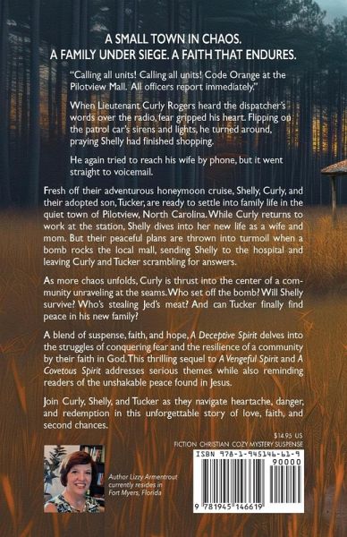A small town in chaos. A family under siege. A faith that endures. "Calling all units! Calling all units! Code Orange at the Pilotview Mall. All officers report immediately." When Lieutenant Curly Rogers heard the dispatcher's words over the radio, fear gripped his heart. Flipping on the patrol car's sirens and lights, he turned around,praying Shelly had finished shopping. He again tried to reach his wife by phone, but it went straight to voicemail. Fresh off their adventurous honeymoon cruise, Shelly, Curly, and their adopted son, Tucker, are ready to settle into family life in the quiet town of Pilotview, North Carolina. While Curly returns to work at the station, Shelly dives into her new life as a wife and mom. But their peaceful plans are thrown into turmoil when a bomb rocks the local mall, sending Shelly to the hospital and leaving Curly and Tucker scrambling for answers. As more chaos unfolds, Curly is thrust into the center of a community unraveling at the seams. Who set off the bomb? Will Shelly survive? Who's stealing Jed's meat? And can Tucker finally find peace in his new family? A blend of suspense, faith, and hope, A Deceptive Spirit delves into the struggles of conquering fear and the resilience of a community by their faith in God. This thrilling sequel to A Vengeful Spirit and A Covetous Spirit addresses serious themes while also reminding readers of the unshakable peace found in Jesus.Join Curly, Shelly, and Tucker as they navigate heartache, danger, and redemption in this unforgettable story of love, faith, and second chances. Lizzy Armentrout Lizzy Armentrout.com Mystery suspense / small town / kidnapping / human trafficking / crime drama / family life / North Carolina / cozy