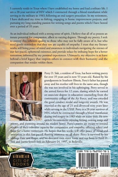 I currently reside in Texas where I have established my home and lead a solitary life. I am a 28-year survivor of HIV which I contracted through a blood transfusion while serving in the military in 1983, following an oral surgery procedure. In my retirement, I have dedicated my time to fishing, engaging in home improvement projects, and pursuing my long-standing passion for writing songs and poems which I have honed over a period of 35 years.¿¿ As an individual imbued with a strong sense of spirit, I believe that all of us possess an innate potential for compassion, albeit to varying degrees. Through my poetry, I seek to convey this inherent quality to those who may not be fully aware of it, but who need gentle reminders that they too are capable of empathy. I trust that my literary works will bring peace of mind and awareness to individuals navigating the stresses of our fast-paced, ephemeral existence, and provide solace by imbuing hope for a better tomorrow, informed by my personal experiences. Ultimately, my objective is to leave behind a brief legacy that inspires others to connect with their humanity and the compassion that resides within them.