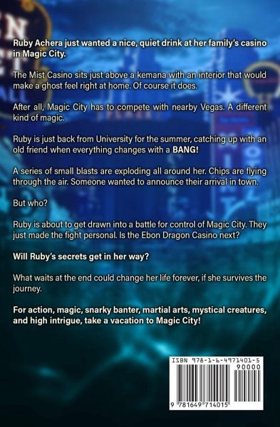 Ruby Achera just wanted a nice, quiet drink at her family's casino in Magic City. The Mist Casino sits just above a kemana with an interior that would make a ghost feel right at home. Of course it does. After all, Magic City has to compete with nearby Vegas. A different kind of magic. Ruby is just back from University for the summer, catching up with an old friend when everything changes with a BANG! A series of small blasts are exploding all around her. Chips are flying through the air. Someone wanted to announce their arrival in town. But who? Ruby is about to get drawn into a battle for control of Magic City. They just made the fight personal. Is the Ebon Dragon Casino next? Will Ruby's secrets get in her way? What waits at the end could change her life forever, if she survives the journey. For action, magic, snarky banter, martial arts, mystical creatures, and high intrigue, take a vacation to Magic City! Scroll up and click the Buy Now button and read it today.