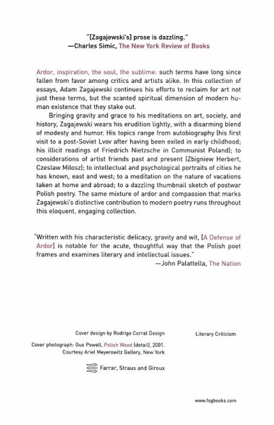 Ardor, inspiration, the soul, the sublime: Such terms have long since fallen from favor among critics and artists alike. In his new collection of essays, Adam Zagajewski continues his efforts to reclaim for art not just the terms but the scanted spiritual dimension of modern human existence that they stake out. Bringing gravity and grace to his meditations on art, society, and history, Zagajewski wears his erudition lightly, with a disarming blend of modesty and humor. His topics range from autobiography (his first visit to a post-Soviet Lvov after childhood exile; his illicit readings of Nietzsche in Communist Poland); to considerations of artist friends past and present (Zbigniew Herbert, Czeslaw Milosz); to intellectual and psychological portraits of cities he has known, east and west; to a dazzling thumbnail sketch of postwar Polish poetry. Zagajewski gives an account of the place of art in the modern age that distinguishes his self-proclaimed liberal vision from the "right-wing radicalism" of such modernist precursors as Eliot or Yeats. The same mixture of ardor and compassion that marks Zagajewski's distinctive contribution to modern poetry runs throughout this eloquent, engaging collection.