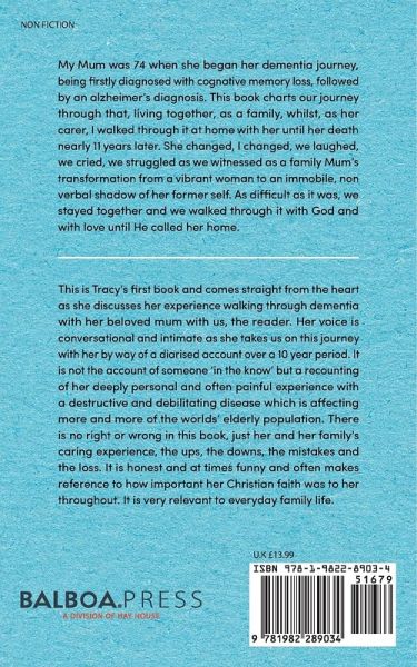 My Mum was 74 when she began her Dementia journey, being firstly diagnosed with cognative memory loss, followed by an Alzheimers diagnosis. This book charts our journey through that, living together, as a family, whilst, as her carer, I walked through it at home with her until her death nearly 11 years later. She changed, I changed, we laughed, we cried, we struggled as we witnessed as a family mum's transformation from a vibrant woman to an immobile, non verbal shadow of her former self .As difficult as it was, we stayed together and we walked through it with God and with love until He called her home.
