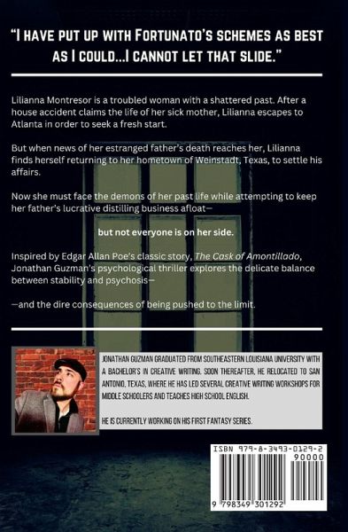 Lilianna Montresor is a troubled woman with a shattered past. After a house accident claims the life of her sick mother, Lilianna escapes to Atlanta in order to seek a fresh start. But when news of her estranged father's death reaches her, Lilianna finds herself returning to her hometown of Weinstadt, Texas, to settle his affairs. Now she must face the demons of her past life while attempting to keep her father's lucrative distilling business afloat- but not everyone is on her side. Inspired by Edgar Allan Poe's classic story, The Cask of Amontillado, Jonathan Guzman's psychological thriller explores the delicate balance between stability and psychosis- -and the dire consequences of being pushed to the limit.