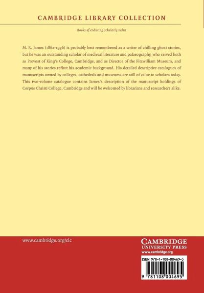 M. R. James (1862-1936) is probably best remembered as a writer of chilling ghost stories, but he was an outstanding scholar of medieval literature and palaeography, who served both as Provost of King's College, Cambridge, and as Director of the Fitzwilliam Museum, and many of his stories reflect his academic background. His detailed descriptive catalogues of manuscripts owned by colleges, cathedrals and museums are still of value to scholars today. This two-volume catalogue contains James' description of the manuscript holdings of Corpus Christi College, Cambridge and will be welcomed by librarians and researchers alike.