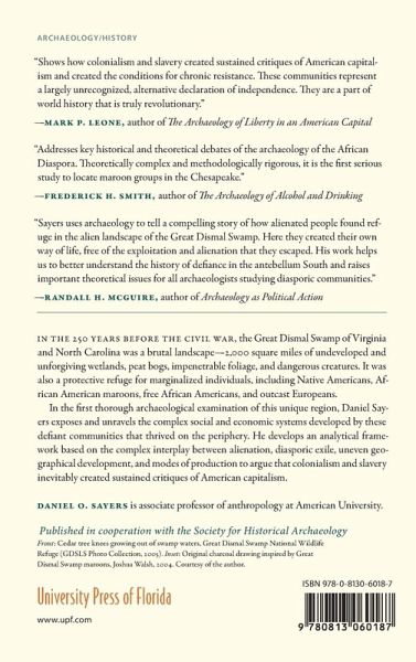 In the 250 years before the Civil War, the Great Dismal Swamp of Virginia and North Carolina was a brutal landscape—2,000 square miles of undeveloped and unforgiving wetlands, peat bogs, impenetrable foliage, and dangerous creatures. It was also a protective refuge for marginalized communities, including Native Americans, African-American maroons, free African Americans, and outcast Europeans. Here they created their own way of life, free of the exploitation and alienation they had escaped. In the first thorough examination of this vital site, Daniel Sayers examines the area’s archaeological record, exposing and unraveling the complex social and economic systems developed by these defiant communities that thrived on the periphery. He develops an analytical framework based on the complex interplay between alienation, diasporic exile, uneven geographical development, and modes of production to argue that colonialism and slavery inevitably created sustained critiques of American capitalism. Published in cooperation with the Society for Historical Archaeology.