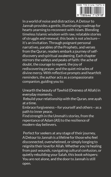 No matter how far you've strayed, the road back to Allah is always open. In A Detour to Jannah, Hajer takes readers on a heartfelt journey of self-reflection, faith, and redemption. In today's fast-paced, hyper-modern world, it's easy to feel disconnected from our faith, overwhelmed by societal pressures, and unsure how to return to the straight path. This book serves as a compassionate guide for those who have lost their way, offering hope, wisdom, and practical steps to rekindle their connection with Allah. Through relatable stories, Islamic teachings, and thought-provoking reflections, A Detour to Jannah reminds us that no one is beyond Allah's mercy. Whether you are struggling with guilt, seeking clarity, or simply wanting to strengthen your faith, this book provides a warm, understanding, and encouraging perspective to help you navigate life's challenges with trust in Allah's guidance. Inside, you'll discover: How to break free from guilt and embrace Allah's mercy Practical steps to reconnect with your faith and strengthen your Iman Overcoming modern distractions and staying spiritually grounded Finding peace through sincere repentance and seeking knowledge A Detour to Jannah is not just a book's invitation to rediscover your purpose, renew your faith, and walk towards Jannah with confidence and hope. Perfect for: Anyone seeking spiritual renewal, those struggling with faith, and Muslims looking for guidance in today's world.