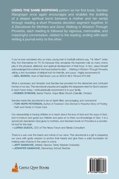 Using the same inspiring pattern as her first book, Sandee Macgregor once again encourages and enables the building of a deeper spiritual bond between a mother and her son(s) through reading a short Proverbs devotion segment together. In A Devotional for Mothers and Sons; Walking in Wisdom Through Proverbs, each reading is followed by vigorous, memorable, and meaningful conversation, related to the reading, ending with each writing a journal entry to the other. Sandee's hope and prayer is that these exchanges will create a unique way in which they each can capture the thoughts and feelings from deep in their own hearts for one another, binding them even closer together and providing mothers and sons with a treasure of memorable words to reflect on for many years to come.