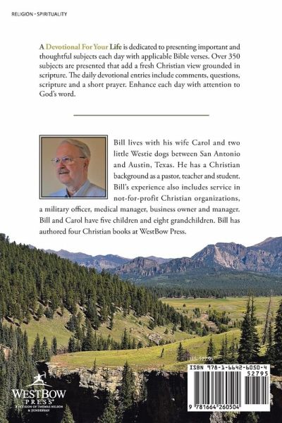 A Devotional For Your Life is dedicated to presenting important and thoughtful subjects each day with applicable Bible verses. Over 350 subjects are presented that add a fresh Christian view grounded in scripture. The daily devotional entries include comments, questions, scripture and a short prayer. Enhance each day with attention to God's word.