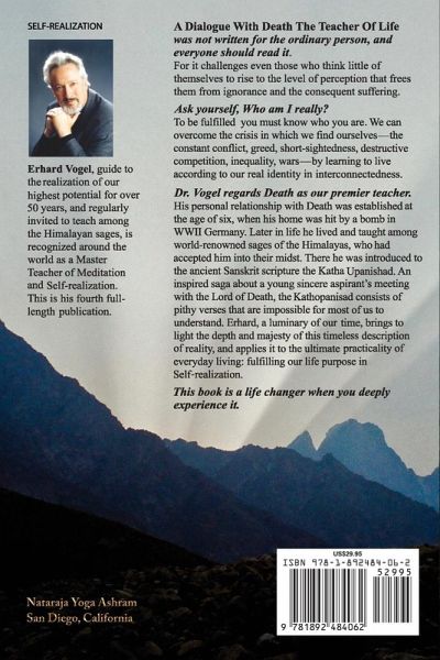 A Dialogue With Death The Teacher Of Life was not written for the ordinary person, and everyone should read it. It challenges even those who think little of themselves to rise to the level of perception that frees them from ignorance and the consequent suffering. Ask yourself, Who am I really? To be fulfilled, you must know who you are. We can overcome the crisis in which we find ourselves-the constant conflict, greed, short-sightedness, destructive competition, inequality, wars-by learning to live according to our real identity in interconnectedness. Dr. Vogel regards Death as our premier teacher. His personal relationship with Death was established at the age of six, when his home was hit by a bomb in WWII Germany. Later in life he lived and taught among world-renowned sages of the Himalayas, who had accepted him into their midst. There he was introduced to the ancient Sanskrit scripture, the Katha Upanishad. An inspired saga about a young sincere aspirant's meeting with the Lord of Death, the Kathopanisad consists of pithy verses that are impossible for most of us to understand. Erhard, a luminary of our time, brings to light the depth and majesty of this timeless description of reality, and applies it to the ultimate practicality of everyday living: fulfilling our life purpose in Self-realization. This book is a life changer when you deeply experience it.