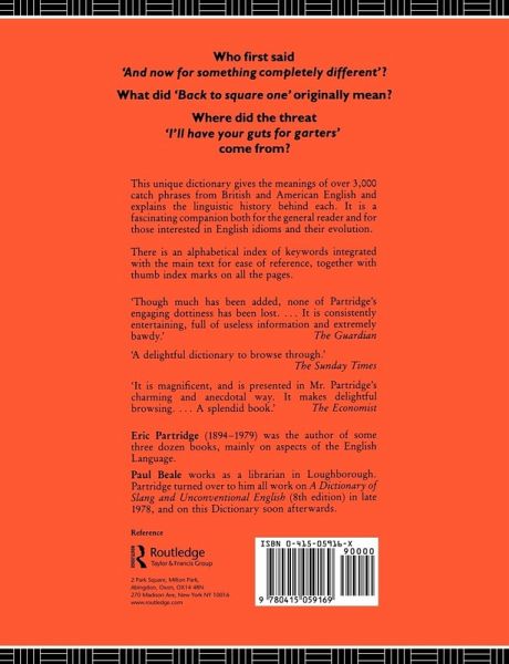 A catch phrase is a well-known, frequently-used phrase or saying that has `caught on' or become popular over along period of time. It is often witty or philosophical and this Dictionary gathers together over 7,000 such phrases.