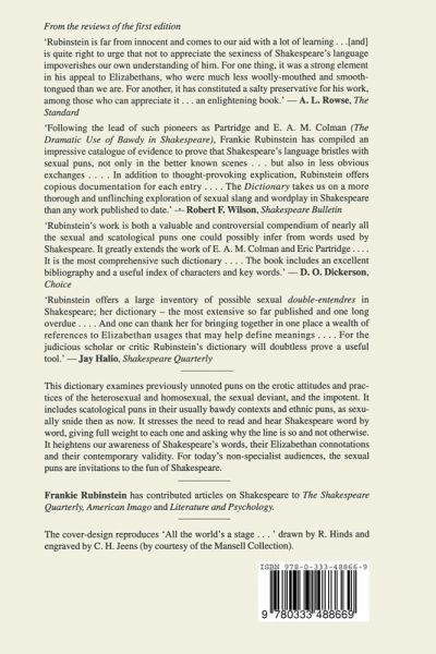 '...Rubinstein is far from innocent and comes to our aid with a lot of learning...and is quite right to urge that not to appreciate the sexiness of Shakespeare's language impoverishes our own understanding of him. For one thing, it was a strong element in his appeal to Elizabethans, who were much less woolly-mouthed and smooth-tongued than we are. For another, it has constituted a salty preservative for his work, among those who can appreciate it...an enlightening book.' A.L.Rowse, The Standard.