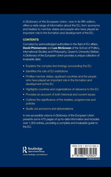 This unique collection of data includes concise definitions and explanations on all aspects of the European Union. It explains the terminology surrounding the EU and outlines the roles and significance of the institutions, member countries, programmes and policies, treaties and personalities. It contains over 1,000 clear and succinct definitions, spelling out acronyms and abbreviations, arranged alphabetically and fully cross-referenced. Among the 1,000 entries you can find explanations and back-ground details on: accession negotiations atmospheric pollution Central European Free Trade Area common agricultural policy company law statute competition policy the euro Governance White Paper human rights MERCATOR Middle East OLAF - European Anti-Fraud Office refugee policy Schengen Agreement Treaty of Nice US-EC Declaration.